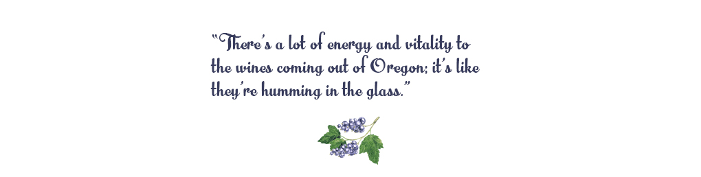 Several of our winemakers talk about biting into a fresh, Oregon strawberry, and it’s really that freshness, that vibrancy. There’s a lot of energy and vitality to the wines coming out of Oregon; it’s like they’re humming in the glass. You drink them and you feel full of life; there’s just something unique about the region itself. And even though each winemaker is different stylistically, there’s this thread that weaves them all together with this freshness and acidity and vibrancy and fruit-forward characteristics that are balanced out. We’re trying to stray away from comparing it to Burgundy, with that more restrained ageability and less austere components that you’d sometimes find in Burgundy.