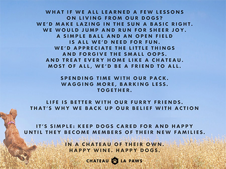 Bold, playful, loyal, friendly...the dogs Chateau La Paws wants to protect have a lot in common with the quality wines they produce! Chateau La Paws wines are inspired by the unique personalities of the shelter dogs featured on their labels.