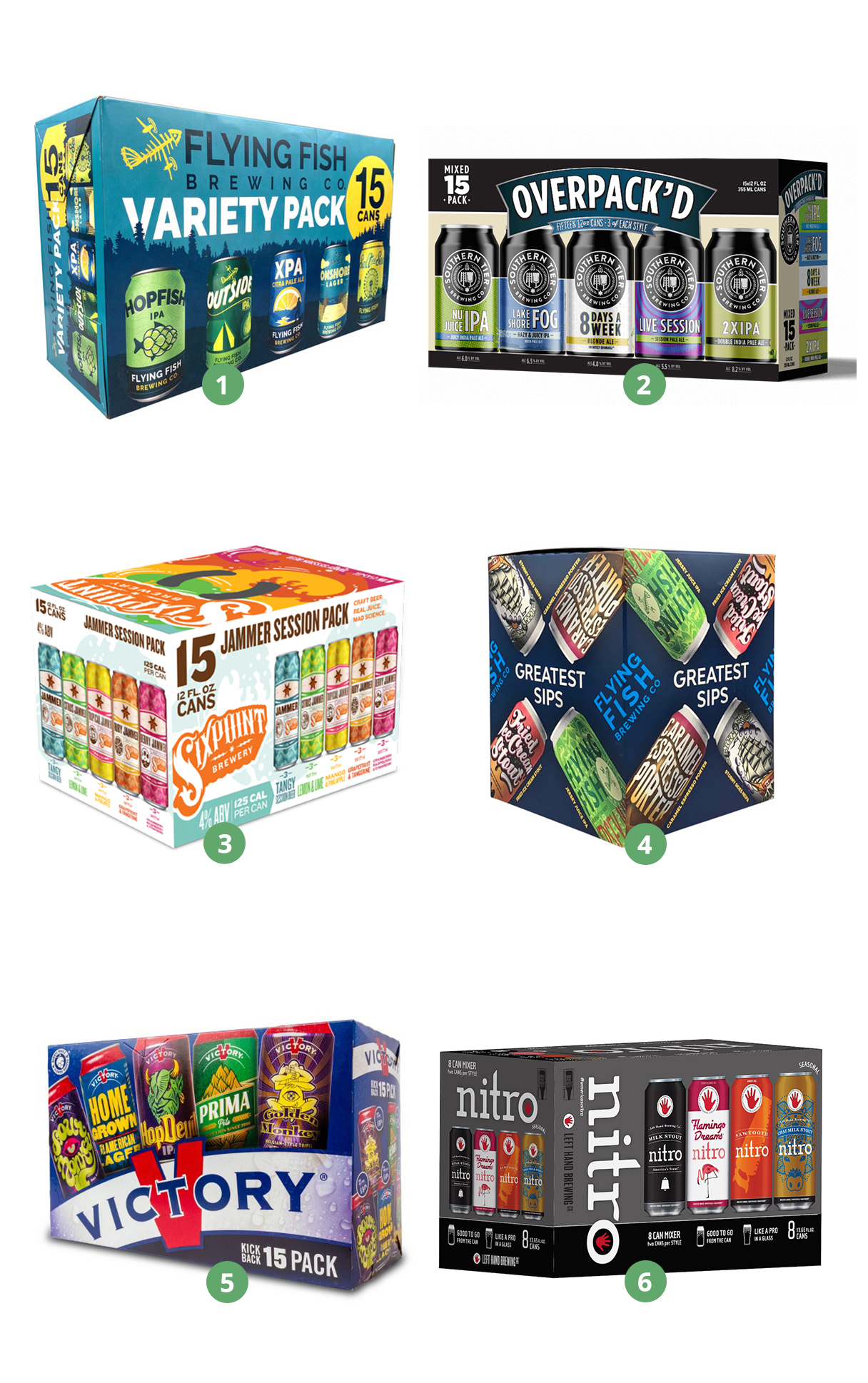 1. Flying Fish Variety Pack Cans 15pk, 2. Southern Tier Overpack’d Cans 15pk, 3. Sixpoint Jammer Cans 15pk, 4. Flying Fish Greatest Sips Variety Pack 4pk, 5. Victory Kick Back Variety Pack Cans 15pk, 6. Left Hand Brewing Nitro Mix Pack