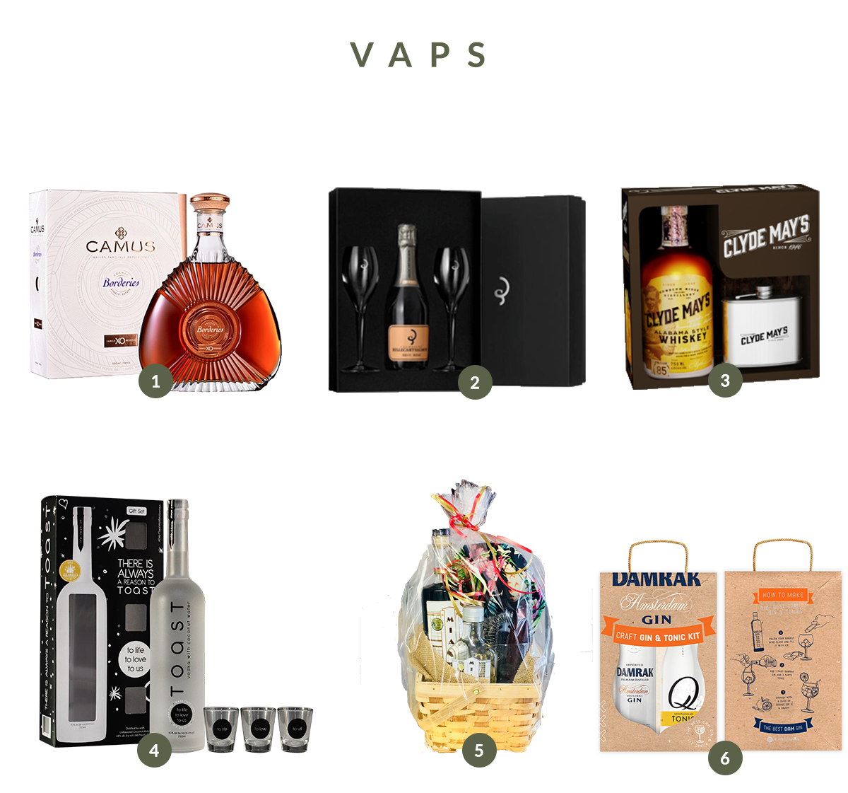 1. Camus XO Borderies, 2. Billecart-Salmon Champagne gift set, 3. Clyde May's VAP with flask, 4. Toast Vodka with shot glasses, 5. Miami Club Rum gift basket, 6. Damrak Gin & Tonic kit