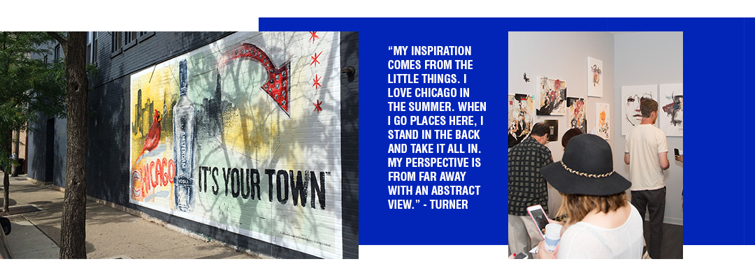 Turner, along with artists from eight other U.S. cities, have partnered with New Amsterdam Vodka for the “It’s Your Town” Art Event Series, which showcases original works by local artists. Adding to the increasing list of Chicago art events, the “It’s Your Town” Chicago stop showcased Turner’s distinctive perspective on the city.