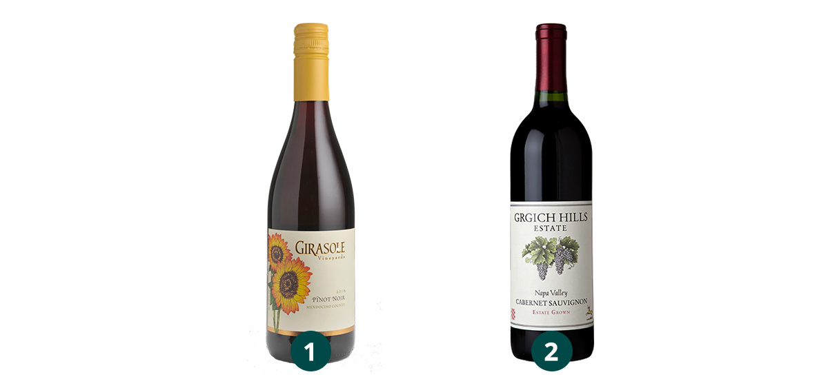 1.) Girasole Vineyards Pinot Noir, 2.) Grgich Hills Estate Cabernet Sauvignon