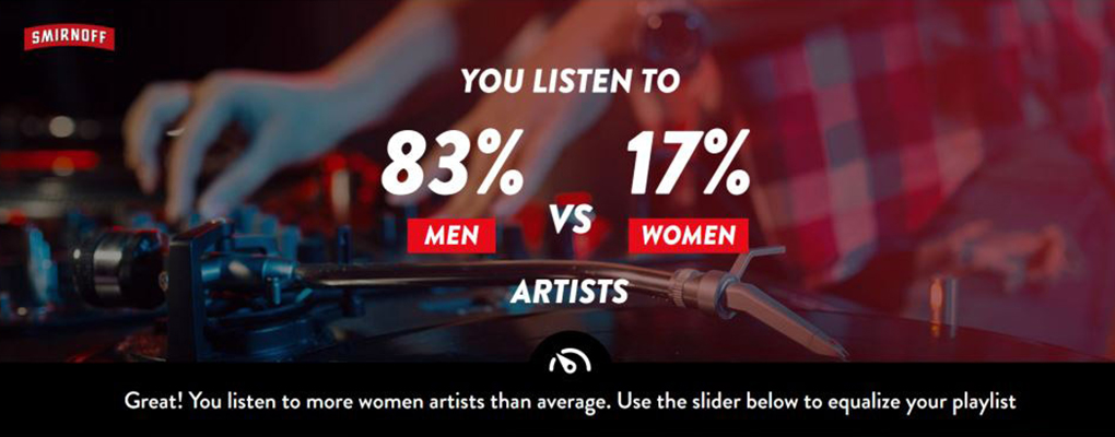 The Smirnoff Equalizer analyzed users listening habits and produced a new playlist, based on their musical preferences, that included more female artists. According to Shah, the campaign helped generate a 52% increase in the number of female artists streamed on Spotify (beyond Beyoncé and Taylor Swift), which is a powerful indication of how engaged users are with the platform and how readily Smirnoff’s messaging is reaching Spotify users.