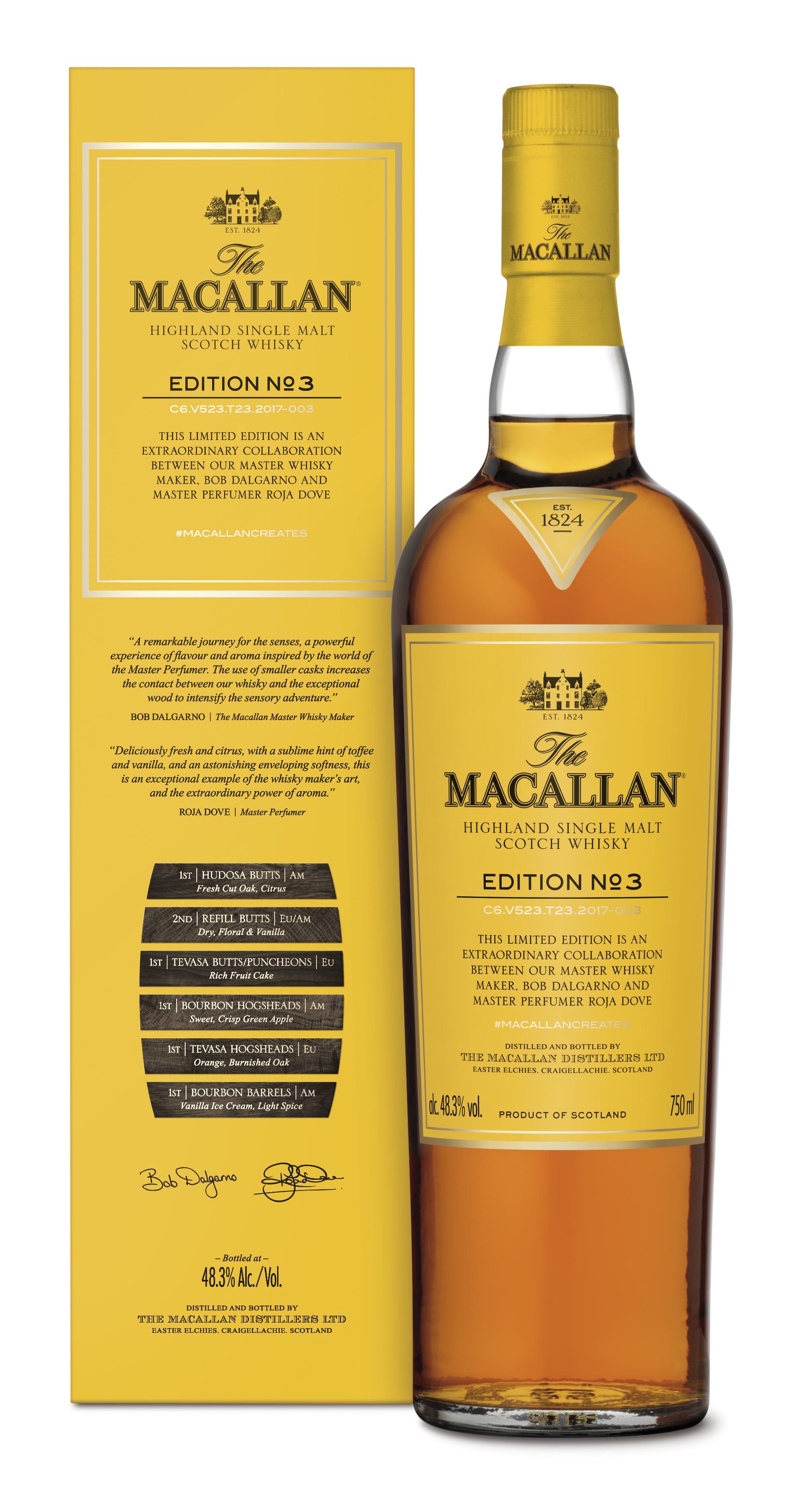Building upon the runaway success of Edition Nos. 1 and 2, anticipation for Edition No. 3 was already high before word leaked that Dalgarno had called on the world’s most respected aroma expert to co-create the limited-edition Scotch. Master Perfumer Roja Dove contributed his singular expertise to delineate the distinctive aromas in The Macallan for this project, and Dalgarno selected the dominant flavor notes to enhance and shape the final character of Edition No.3. This edition delivered a sweet and fruity character, balancing a heavier base derived from the Tevasa cooperage sherry casks with the citrus notes of the Hudosa cooperage sherry casks. The light vanilla flavors in No. 3 are derived from the ex-Bourbon casks and florals and fresh cut oak from the European and American oak refill casks.