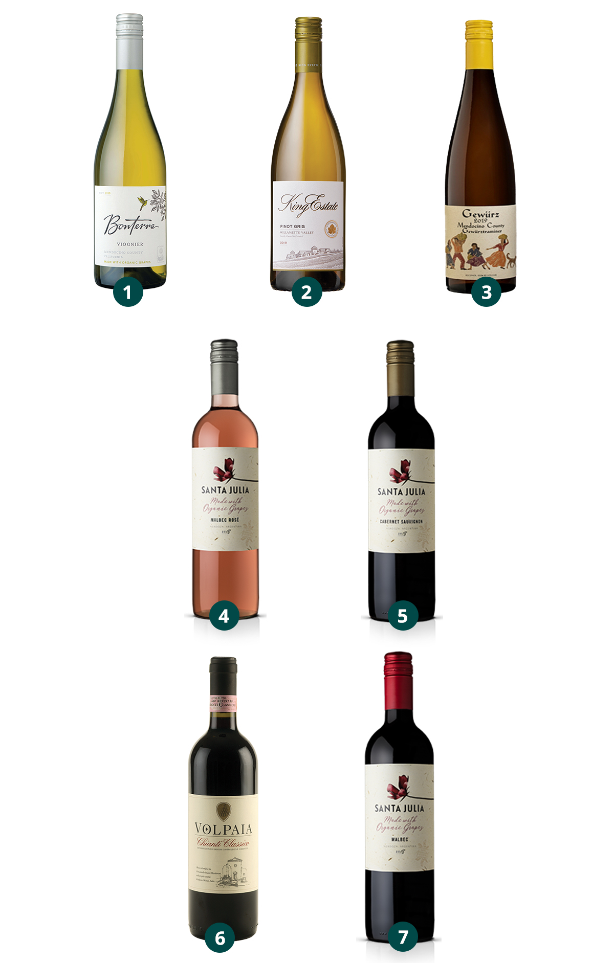 1.) Bonterra Viognier, 2.) King Estate Pinot Gris, 3.) Alexander Valley Vineyards Gewürztraminer, 4.) Santa Julia Organica Malbec Rosé, 5.) Santa Julia Organica Cabernet Sauvignon, 6.) Volpaia Chianti Classico, 7.) Santa Julia Organica Malbec